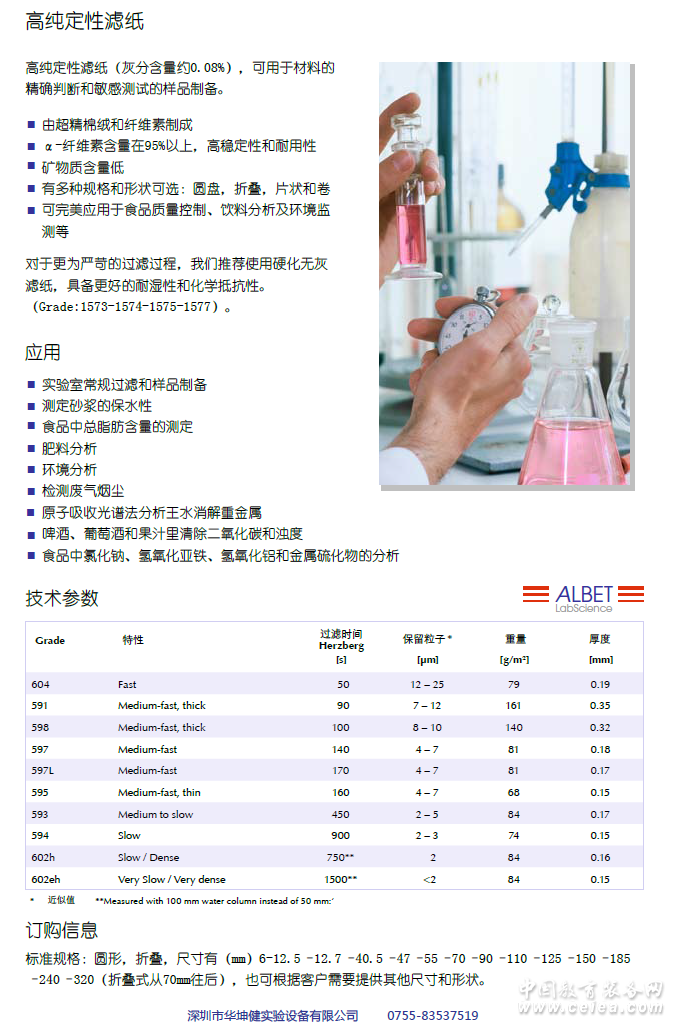 產(chǎn)品詳細(xì)介紹始創(chuàng)于1584年的哈內(nèi)姆勒,是德國(guó)最古老的紙業(yè)制造者。 在400余年的悠久歷史中,公司的創(chuàng)新實(shí)力不斷增強(qiáng),通過(guò)與全球合作伙伴的密切合作,我們可以將研究成果快速轉(zhuǎn)化為新產(chǎn)品。 哈內(nèi)姆勒生產(chǎn)世界最高質(zhì)量的過(guò)濾材料,已有超過(guò)130年的歷史。我們的競(jìng)爭(zhēng)優(yōu)勢(shì)在于產(chǎn)品的高純度和一致性。從原材料的選擇,到生產(chǎn)流程嚴(yán)格的質(zhì)量控制,使我們可以為客戶的高重現(xiàn)性需求提供保證。 我們的產(chǎn)品在多個(gè)領(lǐng)域都得到了客戶的認(rèn)可,包括食品飲料行業(yè),制藥和化學(xué)行業(yè),農(nóng)業(yè)產(chǎn)業(yè),環(huán)境監(jiān)測(cè)與汽車工程領(lǐng)域。 ALBET LabScience是我們的一個(gè)產(chǎn)品商標(biāo),產(chǎn)品系列里包括濾紙,濾膜,濾紙筒和注射器過(guò)濾器等多種產(chǎn)品,專門提供日常實(shí)驗(yàn)室應(yīng)用,產(chǎn)品多種規(guī)格大小以供選擇。 哈內(nèi)姆勒鄭重承諾: 1、100多年開(kāi)發(fā)和制造濾紙的經(jīng)驗(yàn); 2、最高質(zhì)量標(biāo)準(zhǔn)-所有測(cè)試方法均標(biāo)準(zhǔn)化; 3、注重客戶和市場(chǎng)需求; 4、完整的批次追溯系統(tǒng),可追溯到原材料。 硬化的高純?yōu)V紙(灰分含量約0.05%)具有極高的化學(xué)和物理性能,特別適用于真空和壓力條件下過(guò)濾, 以及在酸性和堿性溶液中的使用。 由超精棉絨和纖維素制成; α-纖維素含量在95%以上,具有很高的穩(wěn)定性和耐用性; 濕強(qiáng)度高;容易刮下或洗下沉淀,無(wú)纖維釋出; 經(jīng)少量含氮樹(shù)脂硬化,沒(méi)有雜質(zhì)混入; 礦物質(zhì)含量低; 高耐腐蝕性,如硫酸和硝酸(40%,50℃),堿液(10%,20℃); 有多種規(guī)格可選,圓盤、折疊、片式和卷式。 |