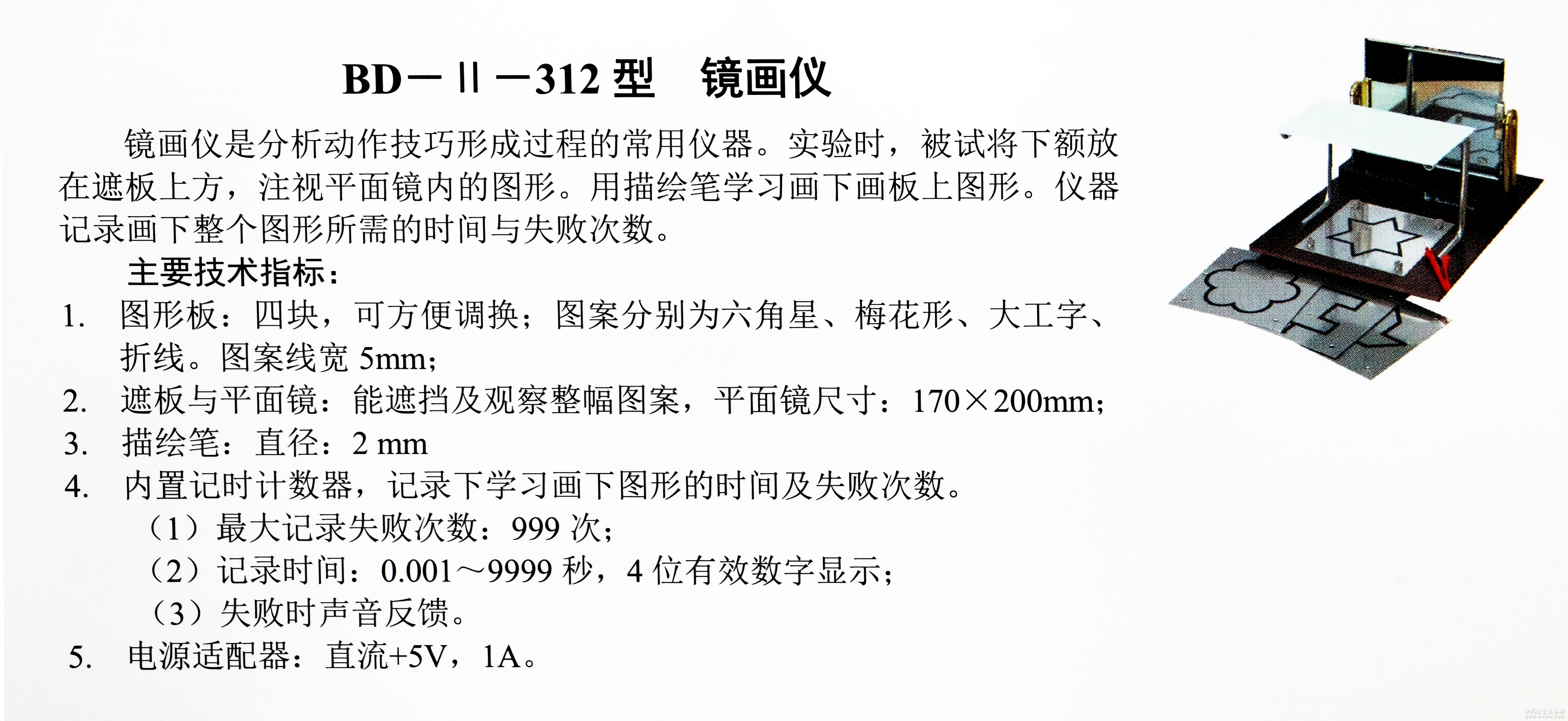 產(chǎn)品詳細(xì)介紹分析動(dòng)作技巧形成的過程,比較用優(yōu)勢(shì)手學(xué)習(xí)鏡畫的熟練程度不同時(shí),對(duì)非優(yōu)勢(shì)手的遷移效果。⒈圖形板:圖案為六角星、梅花形、大工字、折線共四塊,可方便調(diào)換;⒉遮板與平面鏡:能遮擋及觀察整副圖案。平面鏡尺寸:170×200mm;帶定時(shí)記時(shí)計(jì)數(shù)器。⒊描繪筆:直徑2mm。 |