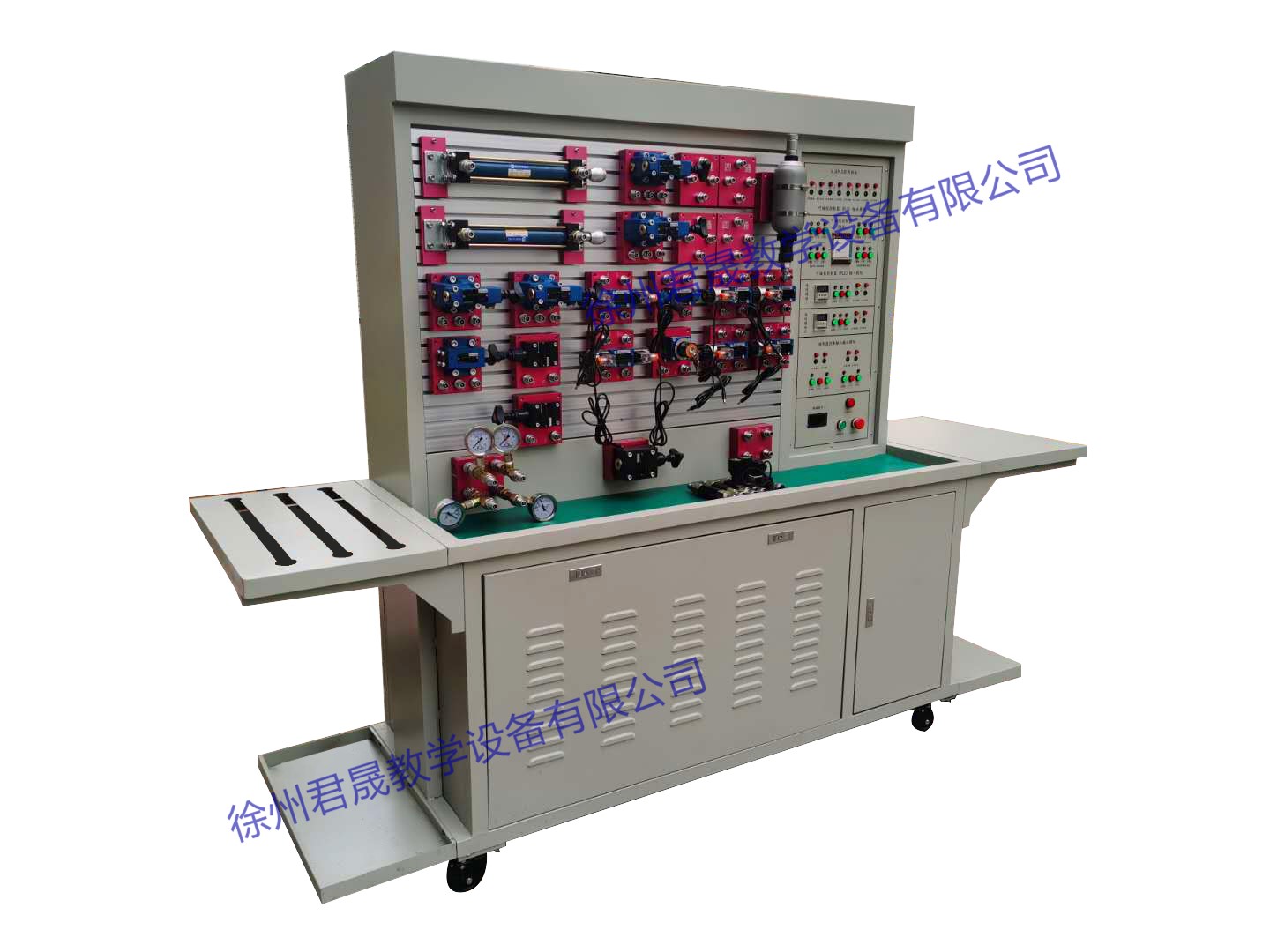 產品詳細介紹JS-YY1型 工業(yè)液壓傳動實驗臺 一、概述: JS-YY1型液壓綜合實訓臺是根據現代實驗教學特點,根據最新的職業(yè)教育的教學和實訓要求設計的實驗臺。各主要元件采用先進的力士樂技術液壓元件,集可編程控制器和液壓元件模塊為一體,除可進行常規(guī)的液壓基本控制回路實驗外,還可進行液壓,組合應用實驗及液壓技術課程設計。它滿足各工科院校、高職、中專、技校及培訓機構對《液壓傳動》、《液壓傳動與控制》、《液壓技術》等課程的實驗教學要求,該實驗臺涵蓋液壓元件技術、繼電器控制技術、傳感器技術、PLC控制技術、電工電子技術、自動化技術等。可以培養(yǎng)和提高學生動手能力、設計能力、綜合運用能力以及創(chuàng)新能力。 二、性能與特點: 1、實驗臺采用2mm冷軋鋼板(靜電噴塑、防腐處理)制作,立式結構,實訓面板為鋁合金材料,并經氧板陽化處理。 2.各液壓元件成獨立模塊,配有方便拆卸的彈性插腳底板,實驗時可以隨意在鋁合金實訓面板上搭接各種液壓回路,組裝回路布局靈活方便、清晰明了。 3.系統(tǒng)全部采用標準的工業(yè)用液壓元器件,使用安全可靠,貼近工業(yè)化。所有液壓閥采用國際先進的力士樂技術液壓元件,且完全符合工業(yè)應用標準 4.快速而可靠的連接方式,每個接頭都配有帶自鎖結構的單向閥,即便連接回路中接頭未接好而脫落,亦不會有壓力油噴出,保證實驗安全、清潔干凈。 5. 實驗回路搭接采用耐壓膠管,壓力可達到21Mpa。 6.可編控制器(PLC)能與PC機通訊:實現電氣自動化控制、可在線編程監(jiān)控及故障檢測,以及可以運用PC機與PLC對液壓控制系統(tǒng)進行深入的二次開發(fā)等; 7. 安全等級高:實驗臺設計完全按照國家安全標準執(zhí)行,所有電氣控制均有接地保護(對地漏電電流超過30mA)、過載保護、短路保護、漏電保護等功能,具有較高的安全使用性能。 三、實驗裝置組成及技術參數: 實驗臺由實驗工作臺、液壓泵站、液壓元件、測試傳感器、電氣控制單元等幾部分組成。 1、實驗工作臺 1)實驗工作臺整體以2.0MM厚的鋼板為主框架,外形緊湊、結實、美觀; 2)實驗臺表面采用靜電噴塑等處理,充分考慮適應各種實驗室環(huán)境; 3)實訓屏采用航天級帶"T"型溝槽工業(yè)鋁合金型材,可方便、隨意地安裝液壓元件、傳感器等,搭接各種實驗回路。 2、液壓泵站 系統(tǒng)額定工作壓力:6.3Mpa。(最大可至7Mpa) 雙泵式 1)電機功率:2.2KW、1.5KW各一臺 轉速1450r/min(2臺) 變量葉片泵額定壓力:7Mpa 公稱排量6.67ml/r(1臺) 定量葉片泵額定壓力:7Mpa 公稱排量8mL/r(1臺) 2)油箱:公稱容積65L;附有液位、油溫指示計,吸油、回油濾油器,空氣濾清器等; 3)液壓油:32#抗磨液壓油。 3、常用液壓元件 1)主要液壓元件均為力士樂技術工業(yè)液壓元件,具體型號及種類詳見配置清單; 2)每個液壓元件均配有油路過渡底板,采用專用彈性插腳底板固定,可方便、快速地將液壓元件固定在鋁合金型材面板; 3)每個液壓元件的控制油口全部安裝有開閉式快換接頭,采用國際先進的密封材料,油路搭接、拆裝方便,密封性能好。 4、電子電氣單元 1)可編程序控制器(PLC):采用S7-200系列,CPU224 I/O口24點,繼電器輸出形式,電源電壓:AC 220V/50Hz,控制電壓為DC24V, 2)直流電源:DC24V、4.5A;(直流電源短路、過載自動斷路,重新啟動即可恢復正常使用) 3)電氣控制線路設有短路保護、過載保護、漏電保護等功能,采用電氣元器件全部符合IEC電氣標準; 5、實驗臺主要技術參數 1)主電源:國家標準工業(yè)用電——AC380V、50HZ; 2)控制電壓:安全控制電壓——DC24V; 3)系統(tǒng)總功率:≤5KW; 4)安全保護:具有漏電壓、漏電流保護裝置,安全符合國家標準。 5)工作臺外形尺寸:長×寬×高=1700mm×650mm×1750mm 6)實驗臺重量:約350KG 四、實驗功能 一) 液壓元件的性能測試: 1)液壓泵的特性測試; 2)順序閥的特性測試; 3)節(jié)流閥的特性測試; 4)調速閥的特性測試; 5)減壓閥的特性測試; 6) 溢流閥的特性測試 二)液壓傳動基本回路演示實驗: 1. 壓力控制回路: 1) 溢流閥調壓回路; 2) 溢流閥單級遠程調壓回路; 3) 多級溢流閥調壓回路; 4) 雙向壓力調整回路; 5) 溢流閥緩沖回路; 6) 溢流閥限制低壓回路。 2. 速度控制回路: 1) 節(jié)流閥控制的(進油、回油、旁油)節(jié)流調速回路; 2) 調速閥控制的(進油、回油、旁油)調速回路; 3) 差動連接增速回路; 4) 電磁閥和調速閥串聯的減速回路; 5) 節(jié)流閥串/并聯的二次進給回路 6) 節(jié)流閥串/并聯速度換接回路。 3.方向控制回路: 1) 換向閥控制換向回路; 2) 順序閥控制的順序動作回路; 3) 行程開關控制的順序工作回路; 4) 壓力繼電器控制的順序動作回路。 4.減壓回路: 1) 一級減壓回路; 2) 二級減壓回路; 3) 多級減壓回路。 5. 單向同步回路: 1) 節(jié)流閥控制的同步回路; 2) 調速閥控制的同步回路; 3) 液壓缸串聯同步回路。 6.卸荷回路: 1) M型三位四通電磁換向閥中位機能泄壓回路; 2) 二位三通電磁換向閥卸荷回路。 7.卸壓回路: 1) 節(jié)流閥卸壓回路; 2) 溢流閥卸壓回路。 8.平衡回路 1) 順序閥控制的平衡回路。 9.保壓回路: 1) 液控單向閥的保壓回路。 10.鎖緊回路: 1) 換向閥閉鎖回路; 2) 單向閥的鎖緊回路。 三) 可編程序控制器(PLC)電氣控制實驗,機電液一體化控制實驗: 1) PLC的指令編程,梯形圖編程的學習; 2) PLC編程軟件的學習及使用; 