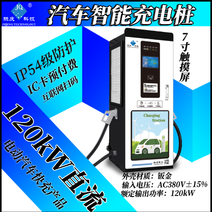 產品詳細介紹品牌:際慶科技 型號:120KW直流充電樁 1.產品型號:DC120S/D34 2.外形尺寸(寬深高):650*500*1690mm 3.外殼材質:鈑金 4.輸入電壓:AC380V±15% 5.額定輸出功率:120kW 6.充電樁自帶充電槍,電纜長度5米 7.具備功能:IC卡預付費、互聯網掃碼 8.人機交互形式:7寸觸摸屏 9.防護等級:IP54
