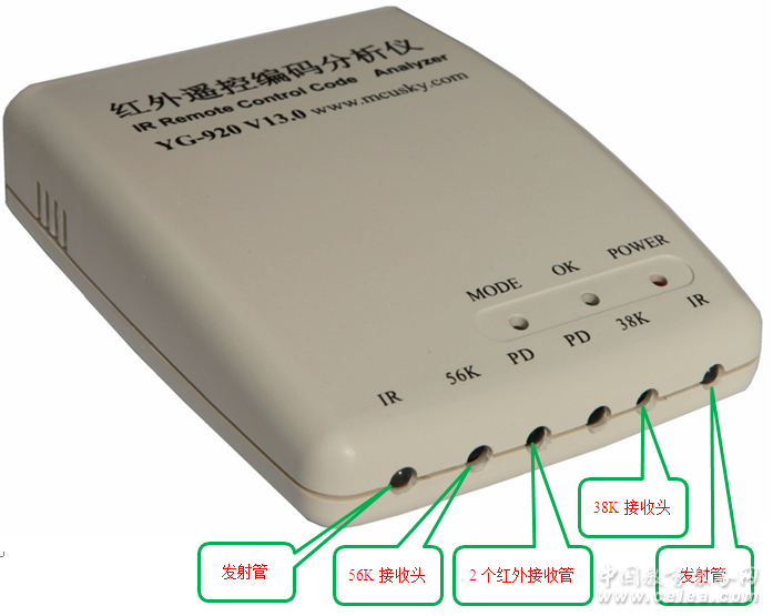 【采樣設備特點 】 YG-920 V13.0 支持在線升級固件程序, YG-920 V13.0 采樣器采用32位處理器,100MHz主頻,高精度測量,0.1微秒級分辨率。 YG-920 V13.0支持紅外發射功能。 USB2.0接口,快速傳輸數據,提高批量測試速度。 支持最長8秒采樣時間,最長1024位的遙控指令,確保能正確接收所有彩電、VCD、DVB、空調等遙控器指令。 同時保留RS-232接口,兼容早期電腦。 直接接收遙控器發出的信號,不必拆開遙控器。 支持38K載波、56K載波、非38K載波、無載波紅外遙控信號。 支持載波頻率測試。 支持信號強度測試。 雙紅外管接收。