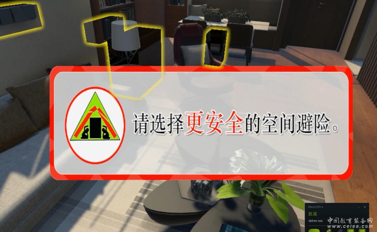 二﹑產(chǎn)品基本功能 用戶可以通過攜帶HTC VIVE 頭盔切換和移動視角,并可以跟虛擬場景進(jìn)行交互動作,沉浸式學(xué)習(xí)地震安全知識。 用戶可以通過VR頭盔查看文字提示和感受語音提示。