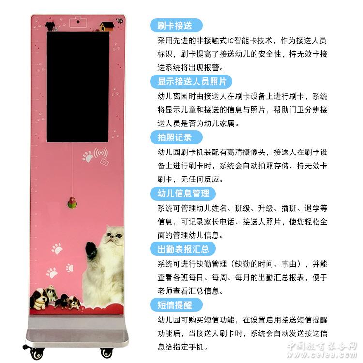 幼兒園刷卡機產品參數: 1.系統版本:網絡版、觸摸板、安卓版; 2.攝像頭功能和智能刷卡功能; 3.內置高品質音箱喇叭,音色完美; 4.金屬質感,新款高檔模具! 5.鏡面鋼化玻璃面板,高端大氣,有效保護液晶屏幕; 6.工業級散熱標準,延長機器使用壽命; 7.操作簡單,系統穩定; 存儲容量:32G電子固態硬盤 顯示:原裝顯示屏、高清分辨率 有線網絡:接口100/10Bease-T以太網 無線網絡: 支持WIFI 數據傳輸協議:TCP/IP通訊協議 電源:AC 220V 使用環境溫度:(-10℃) -70℃ 濕度10%-90% 視頻攝像:200萬像素,廣視角達130度,高清彩色攝像頭 USB接口:USB2.0高速接口 短信功能:在刷卡機刷卡的時候,家長可以實時收到短信 語音功能:刷卡的時候,實時播報學生姓名。 多媒體功能:在顯示器上面,可以播放宣傳學校的內容,也可以寫一些園長的溫馨提示的內容。