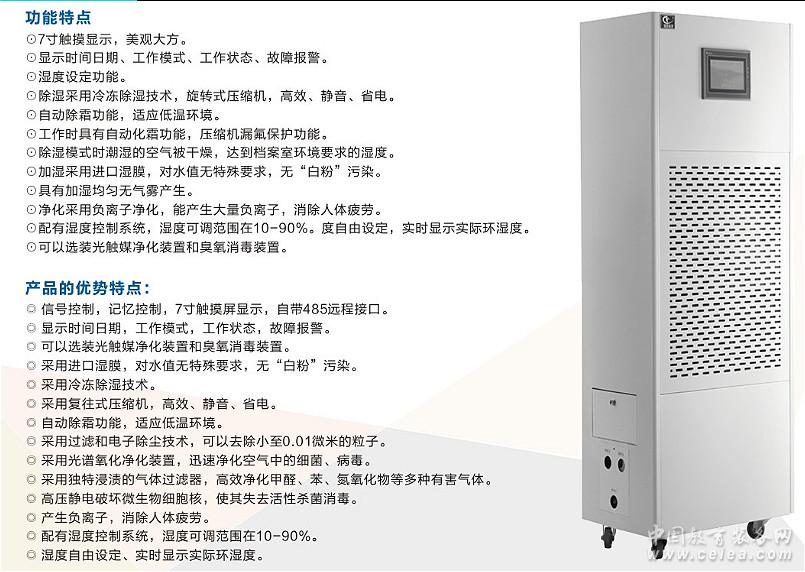 產(chǎn)品的優(yōu)勢特點(diǎn): ◎ 信號控制,記憶控制,7寸觸摸屏顯示,自帶485遠(yuǎn)程接口。 ◎ 顯示時(shí)間日期,工作模式,工作狀態(tài),故障報(bào)警。 ◎ 可以選裝光觸媒凈化裝置和臭氧消毒裝置。 ◎ 采用進(jìn)口濕膜,對水值無特殊要求,無“白粉”污染。 ◎ 采用冷凍除濕技術(shù)。 ◎ 采用復(fù)往式壓縮機(jī),高效、靜音、省電。 ◎ 自動除霜功能,適應(yīng)低溫環(huán)境。 ◎ 采用過濾和電子除塵技術(shù),可以去除小至0.01微米的粒子。 ◎ 采用光譜氧化凈化裝置,迅速凈化空氣中的細(xì)菌、病毒。 ◎ 采用獨(dú)特浸漬的氣體過濾器,高效凈化甲醛、苯、氮氧化物等多種有害氣體。 ◎ 高壓靜電破壞微生物細(xì)胞核,使其失去活性殺菌消毒。 ◎ 產(chǎn)生負(fù)離子,消除人體疲勞。 ◎ 配有濕度控制系統(tǒng),濕度可調(diào)范圍在10-90%。 ◎ 濕度自由設(shè)定、實(shí)時(shí)顯示實(shí)際環(huán)濕度。