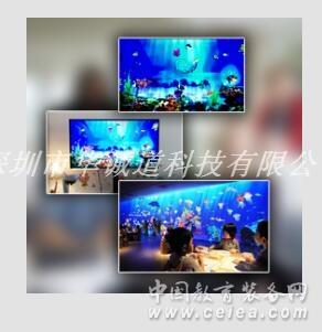 用水彩筆涂出的海洋動物在大屏蓽上栩栩如生、來回游動。