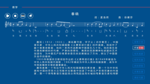 點擊教學模塊,根據九個年級上下冊劃分為18個學期的模塊,每個模塊包括教科書中各個單元的教學內容。進入年級,首次點開后輸入班級,系統會自動記錄各班的課程進度?蓜摻ǘ鄠班級。進入課程,左邊顯示的是上下學期,右邊是課程的縮略圖,進入課程,界面展示的是《XXX 》課,分為最上面的曲譜部分和最右面的功能欄。