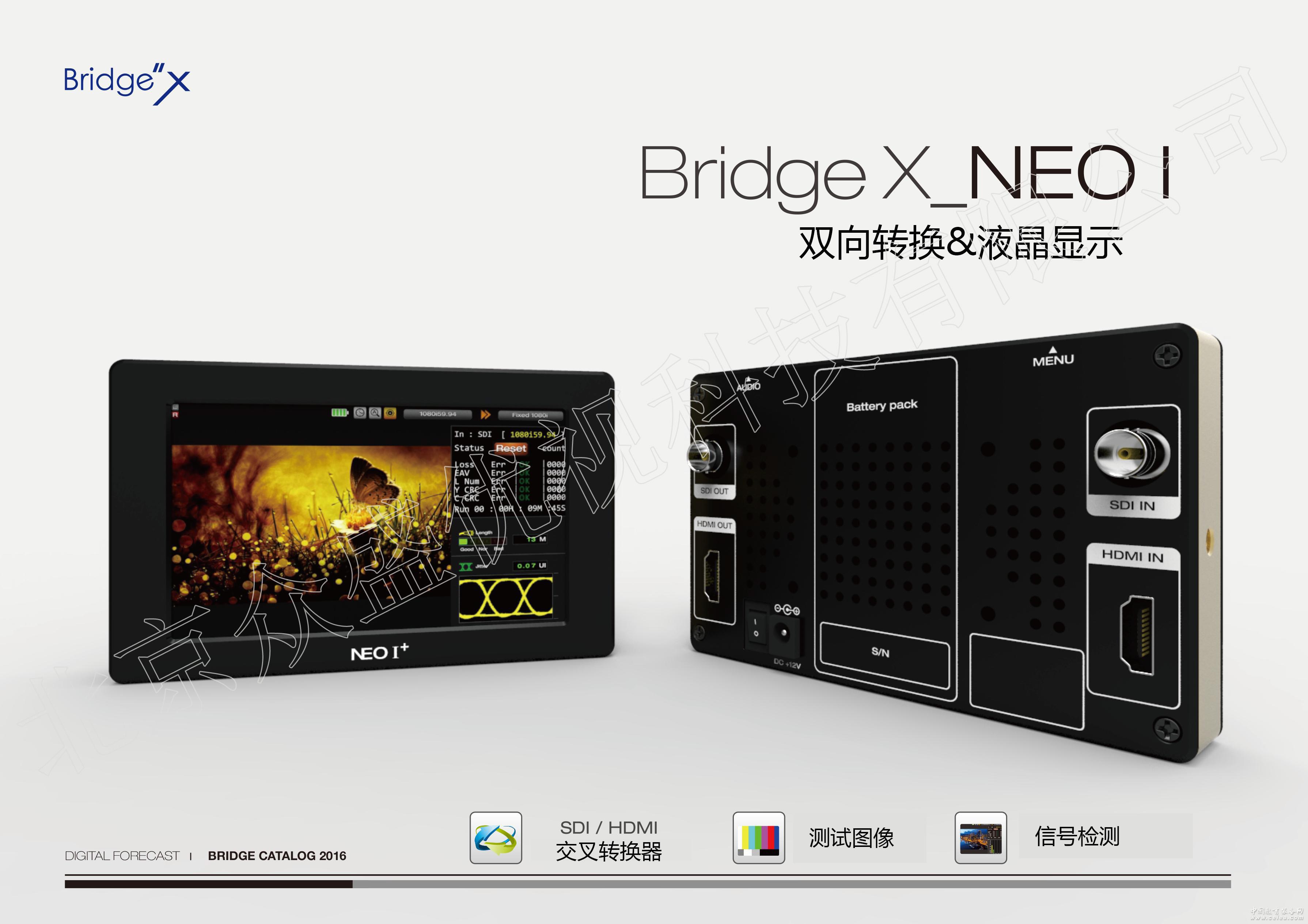 產(chǎn)品詳細介紹Bridge X_NEO I 支持HDMI與SDI視頻格式上下交叉轉(zhuǎn)換,具有5寸觸摸屏,可實時監(jiān)測各種數(shù)據(jù),同時支持對SDI和HDMI信號進行分析,檢查信號質(zhì)量,讓視頻測量變得更容易; Bridge X_NEO I應(yīng)用領(lǐng)域非常廣泛,可作為一個小型的監(jiān)視器,也可作為便攜式信號監(jiān)測儀,可監(jiān)測信號源信號質(zhì)量進行分析,確保輸出。