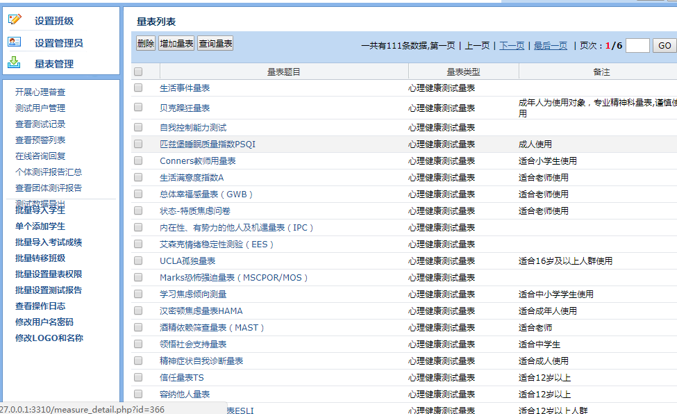 產(chǎn)品詳細介紹擁有110個最新修訂量表量表,包含最權(quán)威的scl90等 軟件完全按照學(xué)校日常的分級管理而設(shè)計,主要分為校級管理員(分管心理健康教育的校長、心理輔導(dǎo)老師等)、班級管理員(班主任、輔導(dǎo)老師、學(xué)科老師等)和測評人員(學(xué)生或老師或家長)三個登陸端口。 校級管理員可以直接管理全校學(xué)生,班級管理員只能看到本班學(xué)生情況。(教育部明確指出心理健康教育的主力軍是班主任,所以班主任通過該系統(tǒng)了解每個學(xué)生的情況是非常有必要的。) 軟件還擁有:心理普查、測試用戶管理、查看測試記錄、查看預(yù)警列表、在線咨詢、個體測評報告匯總、查看團體測評報告、測試數(shù)據(jù)導(dǎo)出、批量導(dǎo)入學(xué)生、單個添加學(xué)生、批量導(dǎo)入考試成績、批量轉(zhuǎn)移班級、批量設(shè)置量表權(quán)限、批量設(shè)置測試報告、修改LOGO和名稱等功能,大大降低了心理老師的工作時間,提高了工作效率與管理質(zhì)量。 |