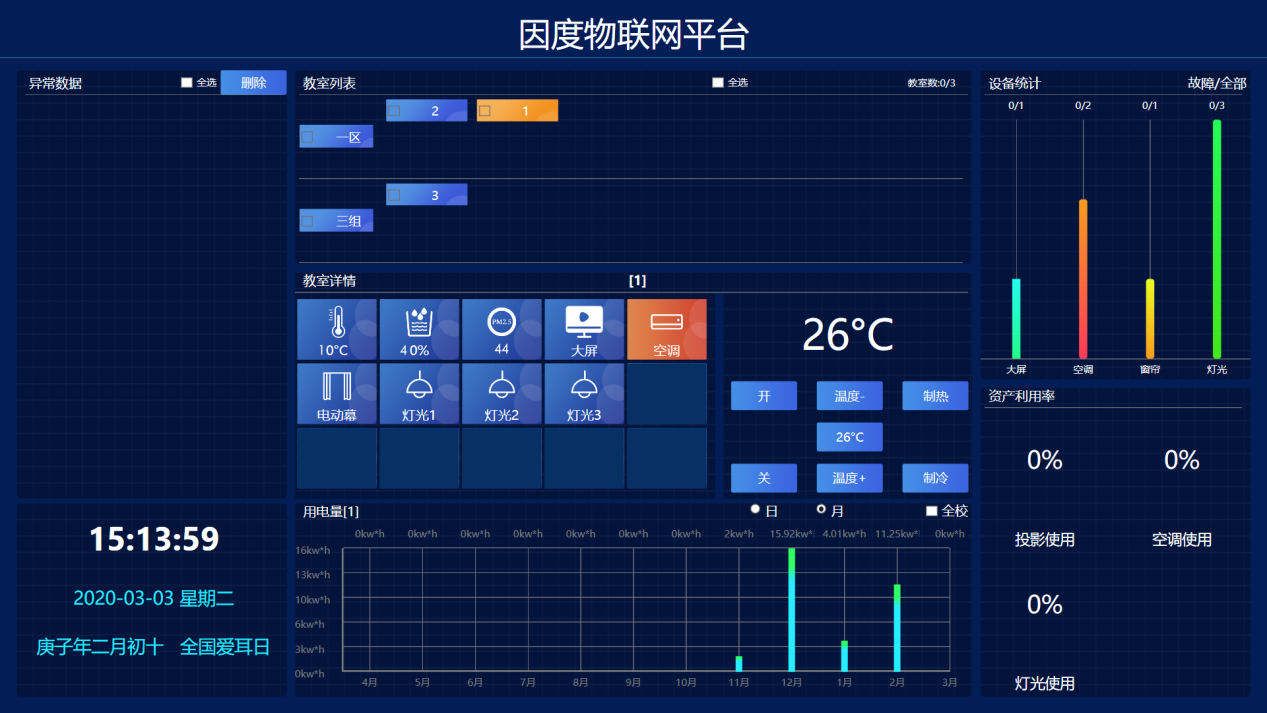 產品詳細介紹方案構成 因度智慧教室物聯網解決方案包括了:windows端大數據管理平臺、手機(安卓)端教室物聯APP、教室內液晶控制面板、空調用電量統計模塊、紅外遙控模塊、燈光控制模塊、電動窗簾控制模塊、PM2.5檢測模塊、煙霧報警模塊、溫濕度檢測模塊等。 方案特點 1.簡單易用。設備狀態一目了然,可輕松實現一鍵開、關機及設備組合使用;可快速分區域遠程控制指定設備。 2.綠色節能。自動檢測各設備運行狀況,實時記錄設備功耗,在控制設備使用成本的同時也延長設備的使用壽命。 3.大數據采集分析。實時采集設備狀態和環境數據,自動對監測數據進行匯總、分析,為管理人員更新和采購設備提供決策支持。 4.安全智能。通過設定異常提醒,及時發現安全隱患并迅速通知相關工作人員,確保校園內人員及設備的安全。 5.實時監控。通過溫度、濕度、煙塵、有害氣體及設備的實時監測和控制,及時掌握校園教學情況。 兼容拓展。可實現局域網廣域網等多種模式,實現教室端液晶面板控制,遠程手機app控制和windows集中大數據管理。 聯系人:駱永強 電話:13722722593 |