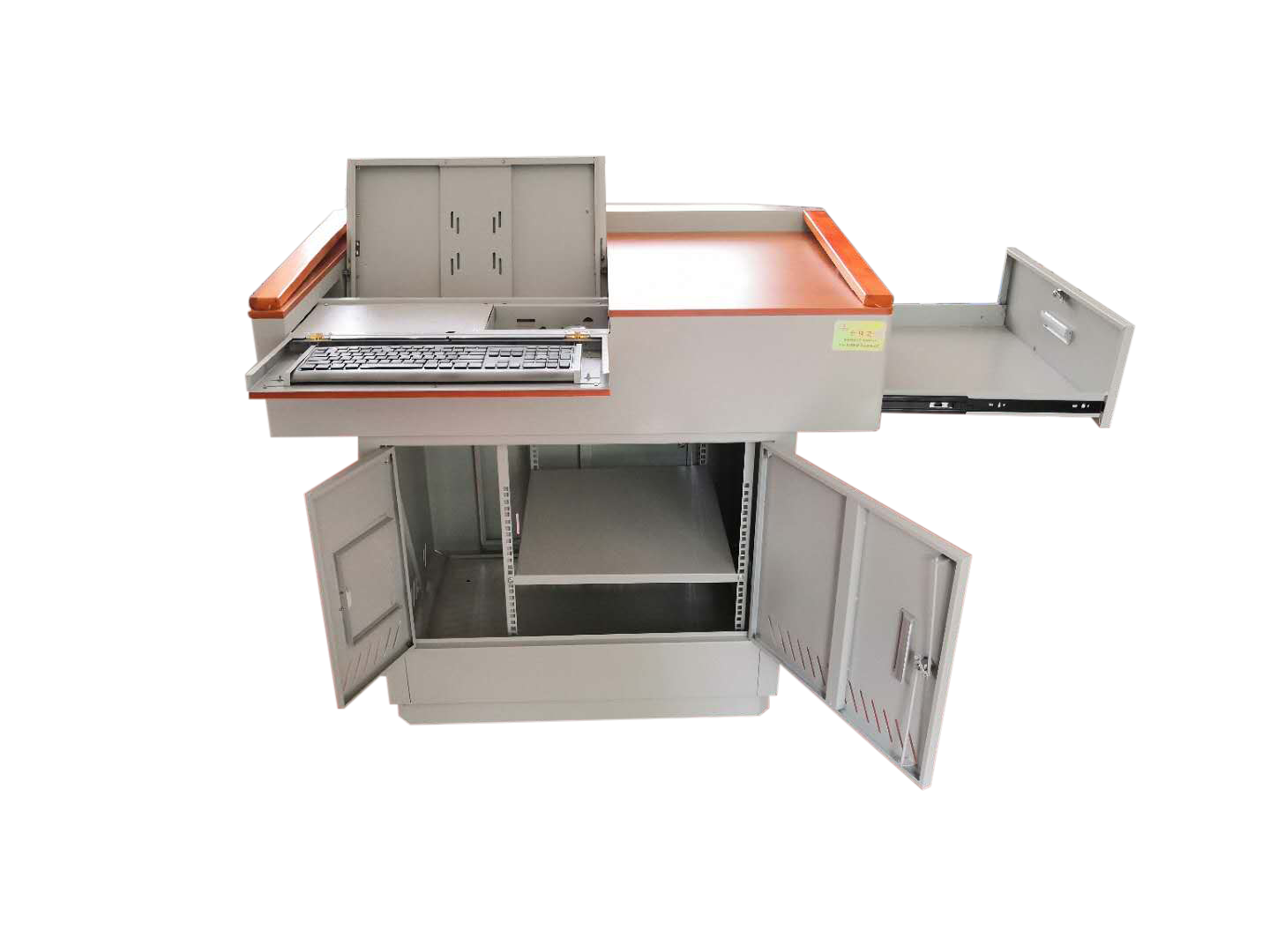 產(chǎn)品詳細介紹1、講桌采用鋼木結合構造,桌體上部分采用圓弧設計。講臺整體設計符合人體力學原理,提供左右木質(zhì)扶手,供使用者扶用。重點部位須采用一次沖壓成型技術;所有鈑金部分均采用激光切割加工,所有尖解倒圓角不小于R3,保證使用者和維護者不劃傷。 2、上柜體只需由一把機械鎖控制,采用環(huán)環(huán)相扣設計,顯示器蓋板、鍵盤、中控和展示臺抽屜逐步打開,臺面平整方便操作。翻轉式顯示器,可任意角度調(diào)整,翻轉式鍵盤架,節(jié)約空間可放置任意大小中控;。操作更簡易,使用更安全。 3、講桌桌面采用木質(zhì)耐劃臺面厚度12mm,閉合時講臺桌面為完整水平木臺面,可作為老師演講桌使用。右側抽屜可放置實物展示臺,關閉后,所有設備都隱藏在講臺內(nèi)。 4、講桌采用優(yōu)質(zhì)加厚冷扎鋼板,上下層采用分體式設計,桌面部分和桌體部分自成一體,方便進出設計比較窄的教室門。講桌內(nèi)置固定螺絲孔位,安裝簡單,安全防盜,獨立包裝,運輸輕便。 顯示器蓋板和鍵盤蓋板均采用翻轉式設計。顯示器蓋板可進行0-120度自由定位調(diào)節(jié)。鍵盤下面放置一體中控或者分體中控系統(tǒng)。 |