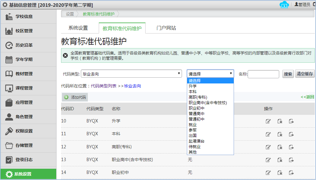 基礎信息管理系統負責學校基本信息的管理、通用參數的設置、通用代碼的維護,確保整個平臺的“編碼、名稱、格式”都能得到統一管理和集中維護。
