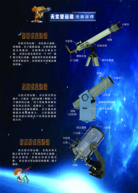 三種天文望遠鏡光路,用發光二極管流水點亮,直觀通路,對使用天文望遠鏡及制作天文望遠鏡能有科學的了解。材料亞克力噴繪,光路流水。