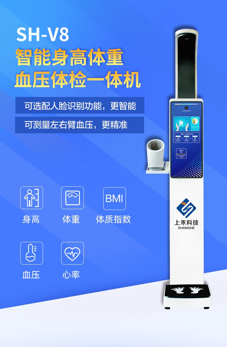 產品詳細介紹超聲波無接觸測量身高、潔凈、衛生,測量速度快,測量精度高 操作系統:采用專業為健康體檢深度定制安卓智4.4能最新OS操作系統,可選擇單項測量,全部順序測量等模式,全程智能語音和動畫提示操作簡單, 通訊方式:提供RS232接口和WiFi接口,藍牙(選配),3G/4G(選配)RJ45網口(選配)。 可與第三方系統數據通信;兼容與醫院、電子病例(EMR)、HIS健康體檢系統數據共享通信; 體重測量方式:精度、高靈敏、高性能精密平衡梁電阻應變式壓力傳感器稱重 身高測量方式:采用美國進口SensComp超聲波傳感器并實現溫度補償功能, 身高測量:20-210cm, 鑒定精度:±0.5cm 分度值:0.5cm或0.1cm可調 體重測量:2.0-500KG,鑒定精度:±0.1kg 分度值:0.1kg或0.01kg可調 BMI體型:采用最新WHO標準或者中國九城市標準(客戶可根據自己需求進行調成)自動計算 血壓測量:1、方式:采用上臂式血壓計測量(支持左右血壓測量) 2、性能:智能加壓技術、示波測定法測量高壓、低壓、心率 3、范圍:血壓:0-299mmHg(0-39.9kpa) 脈搏:40-180times/min 4、精度:壓力:±3MmHg(±0.4kpa)內 脈搏數:±5% LCD顯示:采用10.2寸高清彩色液晶屏,超大字體,醒目清晰顯示,日期時間溫度,與網絡同步,時間準確,顯示體型體型偏胖、正常、偏瘦。 打印功能:采用高速熱敏易裝打印機實現自動打印自動切紙,換紙方便,打印身高體重BMI,理想體重和體重正常范圍等多種信息,還可設置打印醫療衛生單位名稱, 例如:某某疾病預防控制中心某某社區。 自動語音播報:清晰語音報出測量數值并且客戶可以根據使用情況設置提示語音 微信推廣:設備并提供測量數據和微信公眾號的綁定,居民在通過微信掃一掃手機獲取測量數據的同時關注醫療單位公眾號,并提供健康建議,生成健康曲線方便用戶關注體重對健康的影響,方便醫療單位健康知識的宣傳和衛生政策的傳達。 數據存儲:可存儲100萬條以上測量數據,并支持U盤導出, 多媒體廣告屏:采用10.2寸彩色高清液晶屏觸摸大屏,液晶屏上可以設置顯示使用單位名稱, 例如:某某疾病預防控制中心某某社區。自動循環播放視頻音頻及圖片宣傳健康知識或衛生醫療政策,使用單位可以自己更換宣傳片,非常方便。 電源電壓:采用AC100V-240V/12V直流電源,輸入寬電壓適合電壓不穩定地區 消耗功率:待機15W,工作時平均25W 工作環境:溫度-10℃至+40℃ 濕度:20%-85%PH; 推薦使用:醫院、社區服務站、疾控中心、體檢中心、養老中心,企事業單位等部門和單位;