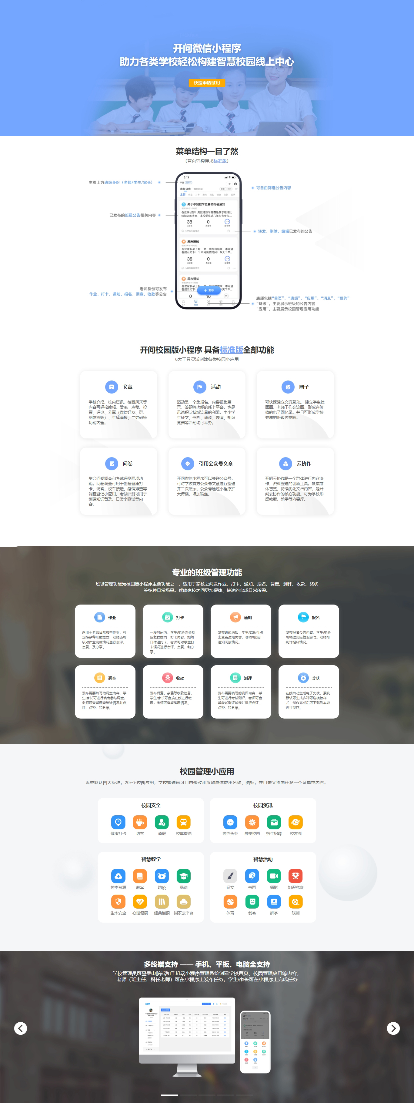 產品詳細介紹開問校園版小程序6大工具靈活創建各類校園小應用: 1、資訊 學校介紹、校內資訊、校園風采等內容可輕松編輯。發表、點贊、投票、評論、分享(微信好友、群、朋友圈等)、生成海報、二維碼等功能齊全。 2、校園、班級活動 活動是一個集報名、內容征集展示、答題等功能的線上平臺,也是迅速積淀私域流量的利器。中小學生征文、書畫、誦讀、表演、知識競賽等活動均可舉辦。 3、班級圈子 可快速建立交流互動。 建立學生社團圈、老師工作交流圈,形成有價值的電子回憶錄。并且可形成學校專屬的班級校友圈。 4、考試 集合問卷調查和考試評測兩項功能。問卷調查可用于創建健康打卡、訪客、校車接送、疫情排查等調查登記小應用?荚囋u測可用于創建知識普及、日常小測試等內容。 5、引用公眾號文章 開問微信小程序可以關聯公眾號,可對學校官方公眾號文章進行整理并二次展示。公眾號通過小程序擴大傳播,增加粉絲,助力學校招生! 6、云協作 云協作是一個群體進行內容協作、資料整理的創新工具。聚集群體智慧、持續優化文檔內容,是開問云協作的核心功能?蔀閷W校形成教案、教學等內容庫。 |