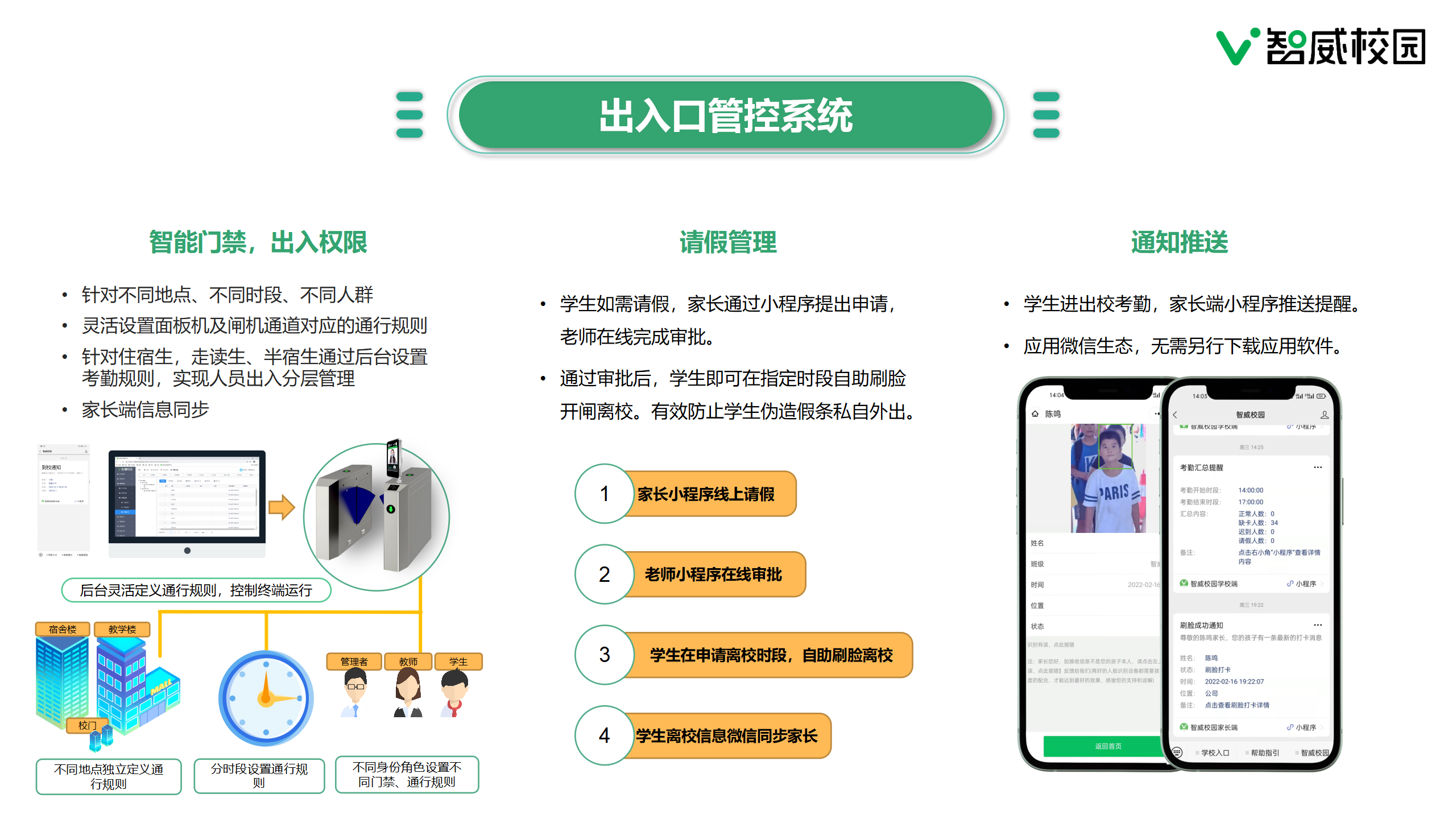 產品詳細介紹智能門禁,出入權限 針對不同地點、不同時段、不同人群 靈活設置面板機及閘機通道對應的通行規則 針對住宿生,走讀生、半宿生通過后臺設置考勤規則,實現人員出入分層管理 家長端信息同步