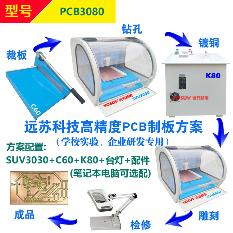 產品詳細介紹遠蘇精電PCB制板方案 PCB雕刻機打樣 雙面板制版設備 (30*30cm方案) 本方案編號:PCB3080 方案配置: 裁板機:型號 C60 雕刻機:型號 SUV3030 過孔電鍍機:型號K80 放大鏡:型號SUV100 配件:雕刻刀 1套/10把 雕刻鉆1套/10把 耗材:覆銅板10片 規格:標配