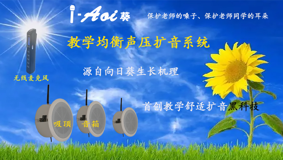 我們多年從事2.4G無線教學擴音設備研發(fā),最新推出i-Aoi(葵)教室均衡聲壓擴音系統(tǒng)。 只有麥克風與若干吸頂音箱組成。音箱內置有源功放與2.4G無線接收模塊,無需布線,插上電源就可以使用。 推薦使用3只(一個太陽、兩支向日葵)音箱在教室內成品字形設置,可達到滿意的均衡擴音需求。 系統(tǒng)工作原理: 源自于向日葵的生長機理。迎著太陽生長,當太陽落山后默默地轉向東方迎接太陽的再次升起。 本系統(tǒng)太陽就是麥克風,眾多音箱中,只有一臺貼有太陽標貼的音箱參與與麥克風的對頻連接。 其余的音箱貼有向日葵標志,稱為“跟隨音箱”。 當麥克風與太陽標貼的音箱連通后,其他跟隨音箱自動連接麥克風參與共同擴音。
