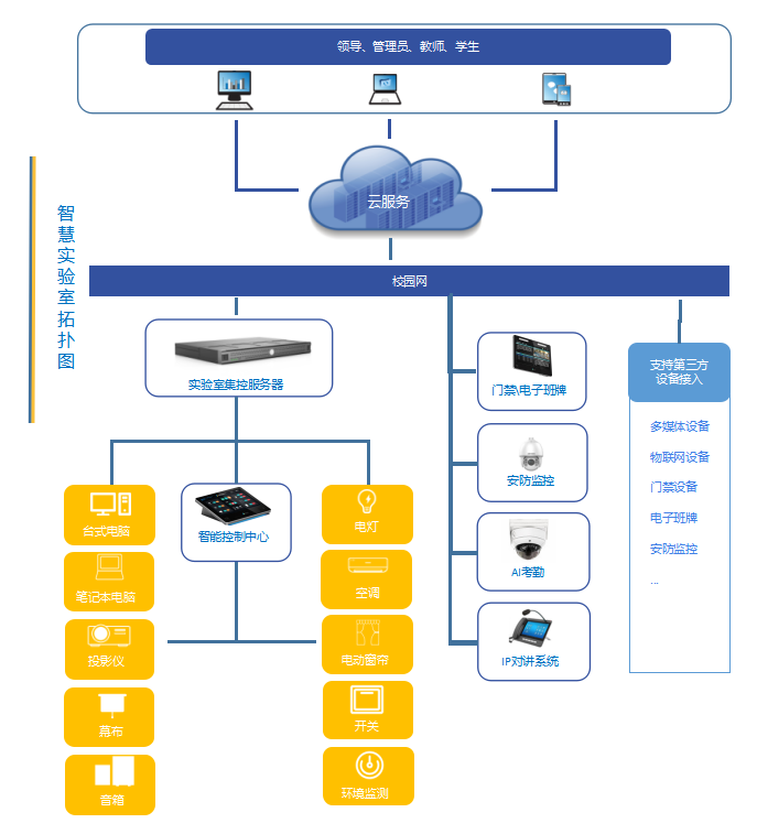 中昱智云智慧實驗室主要由硬件設備、云平臺、應用軟件組成。包含∶門禁\電子班牌系統、監控系統、多媒體管控、基礎設施管控、環境監測、資產盤點、開放預約、智能考勤、教學管理等多個子系統,在實驗室管理中心實現對所有智慧實驗室的統一控制和管理。