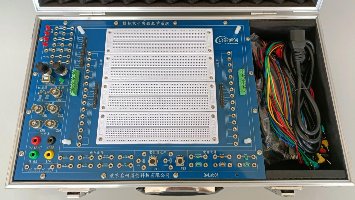 產(chǎn)品詳細(xì)介紹(一)實(shí)驗(yàn)教學(xué)系統(tǒng)主要特點(diǎn): 1.實(shí)驗(yàn)教學(xué)系統(tǒng)必須采用主實(shí)驗(yàn)箱+模塊化的結(jié)構(gòu)組合方式設(shè)計(jì);配有實(shí)驗(yàn)板安裝接口底座,實(shí)驗(yàn)板更換簡(jiǎn)便;實(shí)驗(yàn)電路原理圖布局在PCB板頂層,方便測(cè)量和觀察設(shè)計(jì),多模塊集成,支持模擬電子電路系統(tǒng)設(shè)計(jì)與性能驗(yàn)證,學(xué)生不用插各種芯片和進(jìn)行復(fù)雜連線,提升實(shí)驗(yàn)效率; 2.實(shí)驗(yàn)教學(xué)系統(tǒng)必須便攜式結(jié)構(gòu)、移動(dòng)靈活,箱體尺寸小于55×35×15cm,重量低于5kg;不受實(shí)訓(xùn)室場(chǎng)地限制,方便開展隨堂實(shí)驗(yàn)、技能培訓(xùn)、電子競(jìng)賽等多種活動(dòng); 3.實(shí)驗(yàn)教學(xué)系統(tǒng)實(shí)驗(yàn)板的每個(gè)實(shí)驗(yàn)?zāi)K單元均由電路原理圖和電路實(shí)物兩部分組成,二者對(duì)應(yīng),便于電路直觀識(shí)圖,理論與實(shí)踐結(jié)合; 4.各個(gè)模塊均配有電源(帶LED指示)接線端口、地接線端口,輸入、輸出、地接線柱及各功能測(cè)點(diǎn)接線柱,方便連線操作和接入測(cè)試探頭; 5.提供教學(xué)樣例實(shí)驗(yàn)程序及軟件免費(fèi)升級(jí)服務(wù),并做好培訓(xùn)工作,培訓(xùn)時(shí)間不少于2天,免費(fèi)質(zhì)保期叁年。 (二)實(shí)驗(yàn)教學(xué)系統(tǒng)底板技術(shù)指標(biāo); 1.提供4個(gè)示波器通道;配有標(biāo)準(zhǔn)的BNC接口,帶寬100MHz,實(shí)時(shí)采樣率1GSa/s; 2.提供1個(gè)波形發(fā)生器:配有標(biāo)準(zhǔn)的BNC接口,信號(hào)輸出頻率范圍:DC 1Hz~25MHz,波形幅度:±3.5Vmax; 3.提供萬用表:配有標(biāo)準(zhǔn)的接口,直流電壓量程800V,電流測(cè)量量程10A,二極管測(cè)量范圍2V; 4.提供波形校準(zhǔn)源; 5.上述所提供的各儀器均可與PC機(jī)連接; 6.提供面包板:面包板尺寸170*138mm; 7.直流電源:電源輸出:+5V、-5V、+12V、-12V; 8.可調(diào)直流電源:0~12V,0~-12V; 9.實(shí)驗(yàn)系統(tǒng)電源帶有保護(hù)功能。 (三)實(shí)驗(yàn)內(nèi)容: 1.共發(fā)射極放大電路; 2.共集電極放大電路; 3.共基極放大電路; 4.多級(jí)放大及反饋電路; 5.差動(dòng)放大電路; 6.場(chǎng)效應(yīng)管放大電路; 7.同相比例放大電路; 8.反相比例放大電路; 9.反相比例加法電路; 10.積分電路; 11.微分電路; 12.集成運(yùn)放兩級(jí)放大電路; 13.二階低通有源濾波電路; 14.二階高通有源濾波電路; 15.過零比較器電路; 16.遲滯比較器電路; 17.窗口比較器電路; 18.方波三角波發(fā)生器電路; 19.二極管限幅電路; 20.二極管穩(wěn)壓電路; 21.半波整流濾波電路; 22.全波整流濾波電路; 23.集成功率放大電路; 24.RC正弦振蕩電路; 25.LC振蕩電路; 26.串聯(lián)晶體管穩(wěn)壓電路; 27.三端集成穩(wěn)壓電源實(shí)驗(yàn)。 |