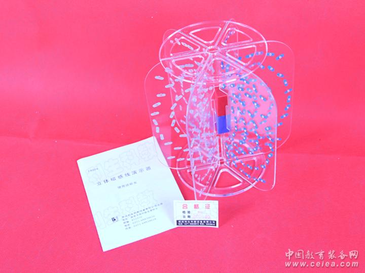 2.透明演示骨架由透明工程塑料制成,呈圓柱形,直徑220mm,高200mm,透明光潔,無縮跡劃傷,組合成的骨架擺置平穩。小鐵針用電工軟鐵材料制成,長12mm,寬4mm,中心孔直徑2mm。小鐵針配置在顯示板上,轉動靈活,不脫落,小鐵針在顯示板上拍的環形磁感線有5條;