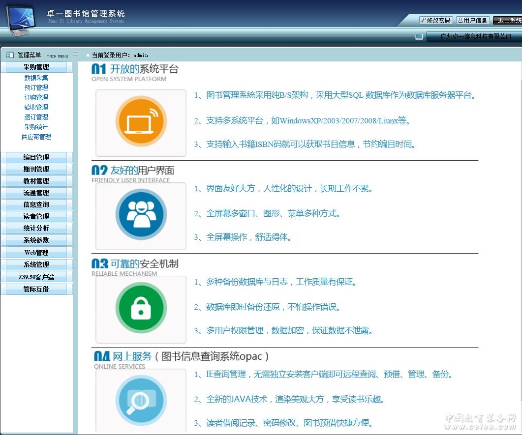 產(chǎn)品詳細(xì)介紹 卓一圖書館管理系統(tǒng)是一套非常專業(yè)且通俗易懂的圖書館信息化管理系統(tǒng),也是國內(nèi)一套圖書館趨勢化的應(yīng)用系統(tǒng),并朝著RFID智能自助圖書館的方向發(fā)展。它符合國家教育部頒布的“校園信息管理平臺標(biāo)準(zhǔn)”的純B/S結(jié)構(gòu)的圖書管理軟件,特別針對各類型圖書館的管理需求而設(shè)計的管理軟件,是圖書館科學(xué)化、信息化、數(shù)字化建設(shè)的最有力工具。它實現(xiàn)了圖書館數(shù)據(jù)采集、編目管理、借閱流通、數(shù)據(jù)統(tǒng)計、圖書檢索、圖書預(yù)借、個人信息查閱等一系列相關(guān)圖書館的操作。它充分發(fā)揮了信息化管理的方便性,快捷性,并與一卡通無縫結(jié)合,讓圖書館管理人員高效地工作。 -------------------------------------------------------------------------------- 產(chǎn)品特點 1、圖書管理系統(tǒng)采用純B/S架構(gòu),采用大型SQL 數(shù)據(jù)庫作為數(shù)據(jù)庫服務(wù)器平臺。 2、支持多系統(tǒng)平臺,如WindowsXP/2003/2007/2008/Liunx等。 3、支持輸入書籍ISBN碼就可以獲取書目信息,節(jié)約編目時間。