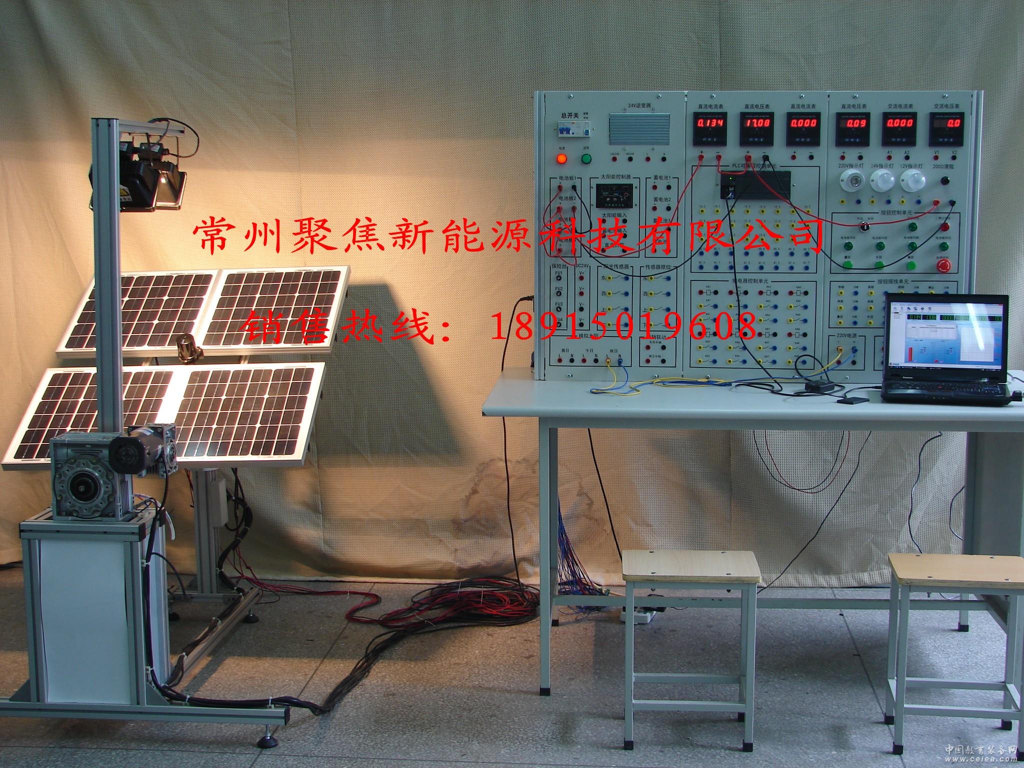 光伏發電控制監控系統由電池板單元、太陽能控制器單元、蓄電池單元、保險單元、陽光傳感器、傳感器限位單元、模擬太陽單元、兩軸聯動單元、plc控制單元、繼電器單元、按鈕及按鈕接線單元、和相應的逆變器儀表電源組成。光伏發電控制監控系統采用接插線的形式進行接線,方便學生自行設計實訓。