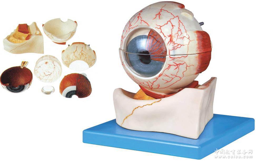 ■ 該模型在上頜骨上方將眼球水平切,由眼球壁鞏膜、脈絡(luò)膜上、下半側(cè)、角膜、晶狀體和玻璃體等7個(gè)部件組成,并顯示眼球壁鞏膜、角膜、虹膜、睫狀體、脈絡(luò)膜和視網(wǎng)膜的構(gòu)造以及眼球內(nèi)容物、眼球外肌、血管和神經(jīng)等結(jié)構(gòu),共有31個(gè)部位指示標(biāo)志。