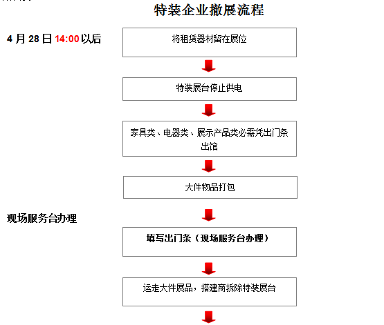 -展會期間,所有成箱的物品出門(包含展品和其他物品)必須先到“現場服務處”開具“出門單”。