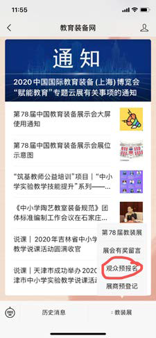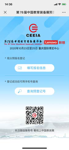 2.手機(jī)端注冊(cè):掃描并關(guān)注“教育裝備網(wǎng)公眾號(hào)”(見圖1);點(diǎn)擊“教裝展”選擇“觀眾預(yù)報(bào)名”(見圖2);選擇“填寫報(bào)名信息”進(jìn)行報(bào)名;