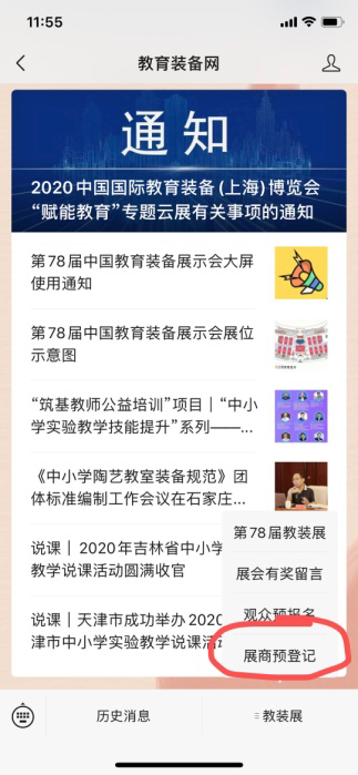 2.手機(jī)端:掃描并關(guān)注“教育裝備網(wǎng)公眾號(hào)”(見圖2),點(diǎn)擊“教裝展”選擇“展商預(yù)登記”(見圖3);選擇“參展商實(shí)名登記”,按照程序步驟填報(bào)參展相關(guān)信息。