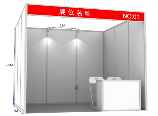 每個(gè)標(biāo)準(zhǔn)展臺(tái)包含:咨詢(xún)桌1張(H750X500X100),折椅2把,電源1處500W,射燈2盞。