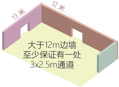 2.展臺設計大于12m的邊墻至少保證有一處3X2.5mH的通道口,請參考下圖示例。如展位邊墻靠近主通道,可將開口位置放置展位通道邊,無須在邊墻中間開口。