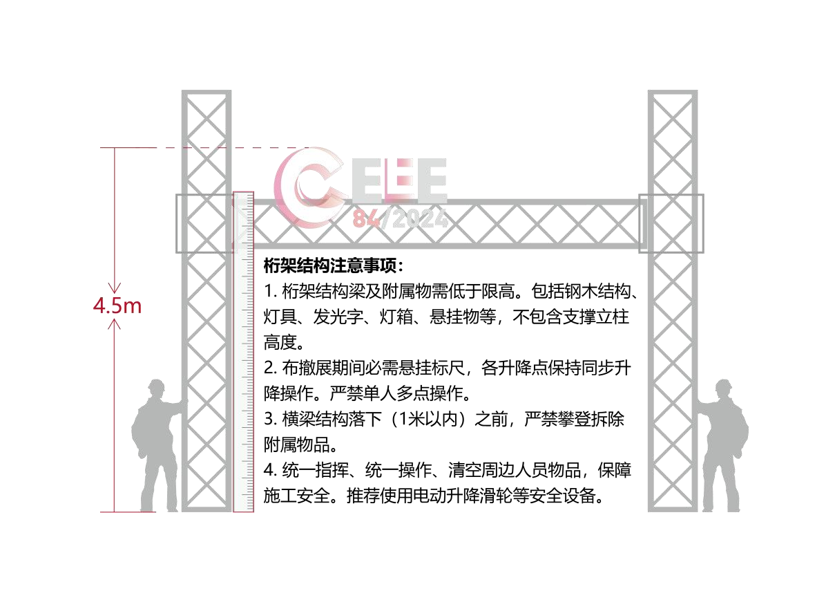 3.展臺搭建限高:4.5米;全館禁止搭建雙層結構或超高展臺,無懸掛物背板厚度不得少于20CM,龍骨間距不得大于40CM;桁架結構展臺高度以及施工標準請參考下圖